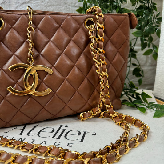 Chanel 1989 Rare Tan Quilted Lambskin CC Charm Tote
