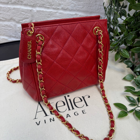 Chanel 1989 Chanel Red Caviar CC Quilted Shoulder Bag