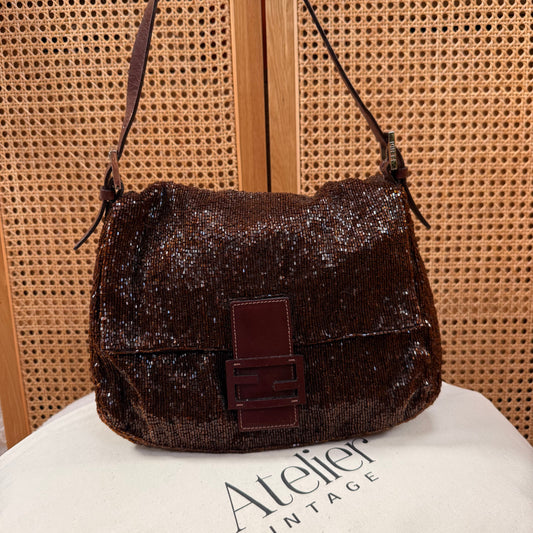 Fendi 2000 Rare Mamma Baguette Bronze - Limited Edition full glass beaded with chocolate leather