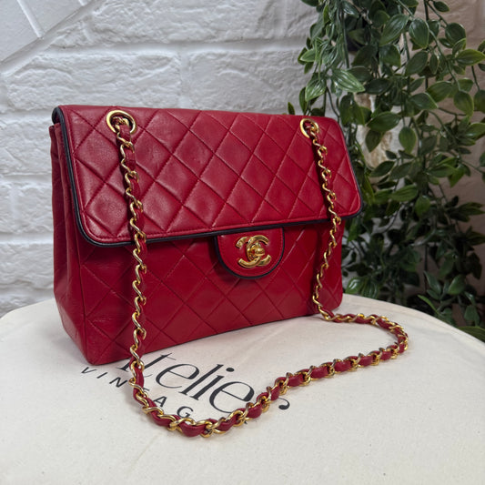 Chanel 1989 Rare Red with navy piping 25cm Square single flap