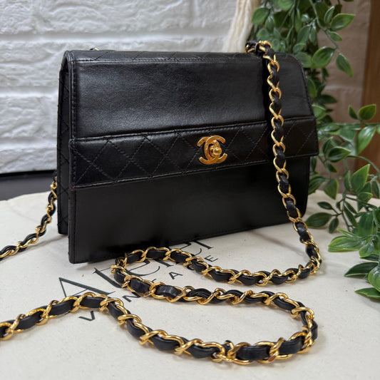 Chanel Early 1980s black half moon quilted CC button flap