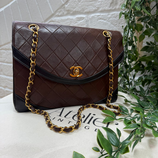 Chanel 1986 chocolate brown & black half moon two way single flap