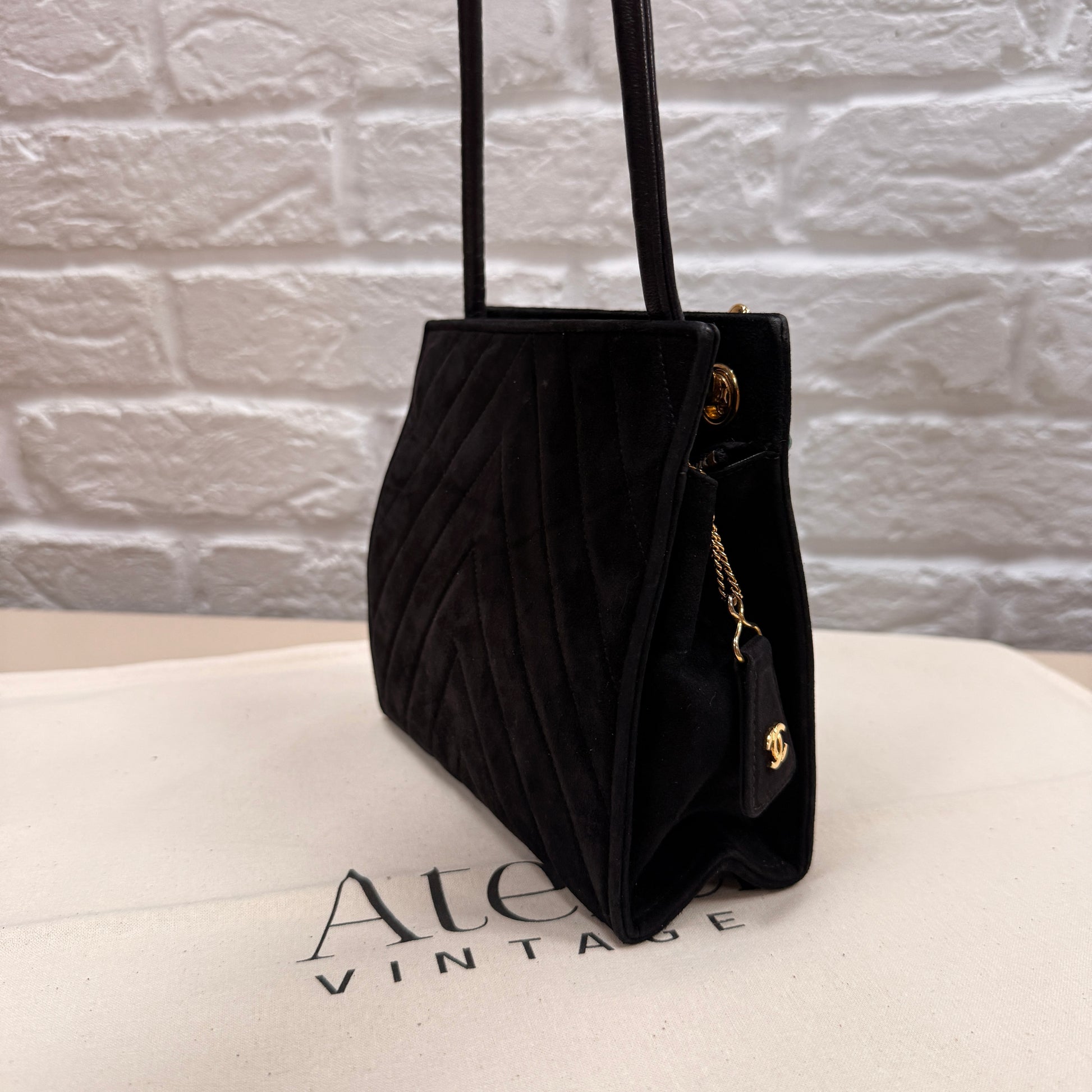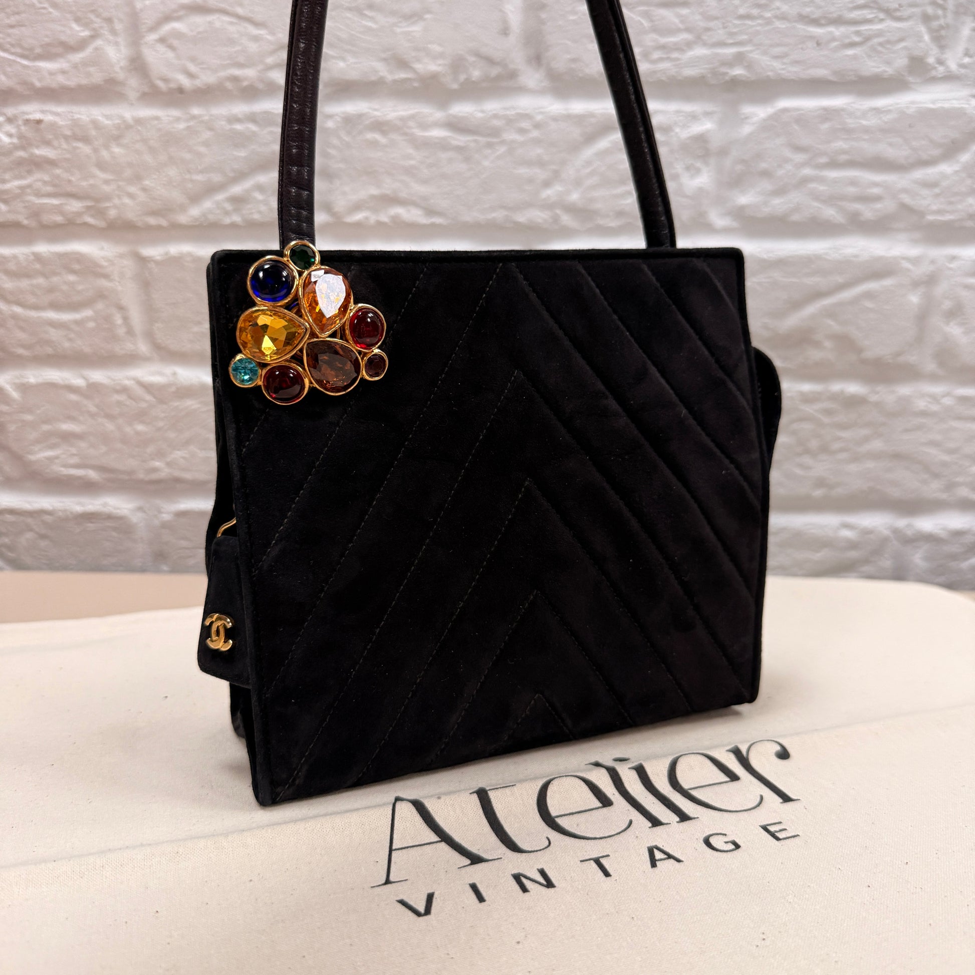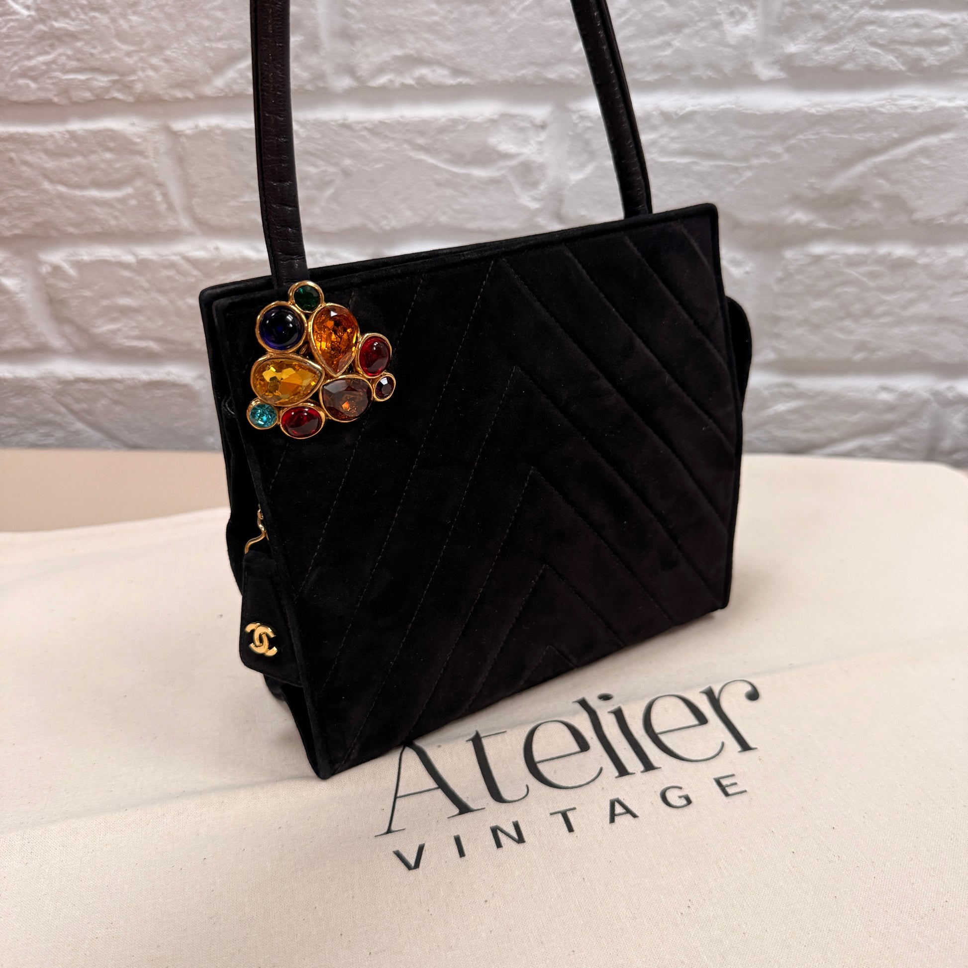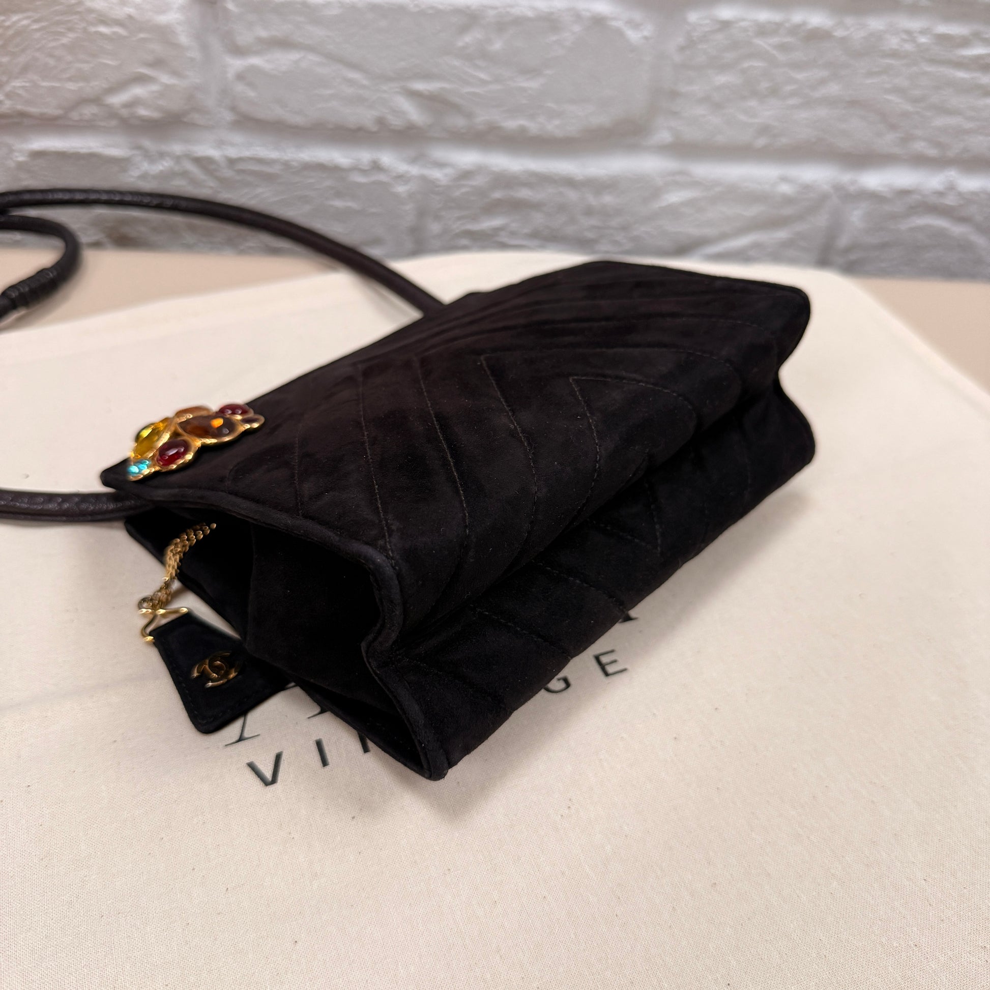 Chanel 1989 Chanel Black Suede & Leather Cross body with rare Gripoix Stone and CC charm Zip Pull
