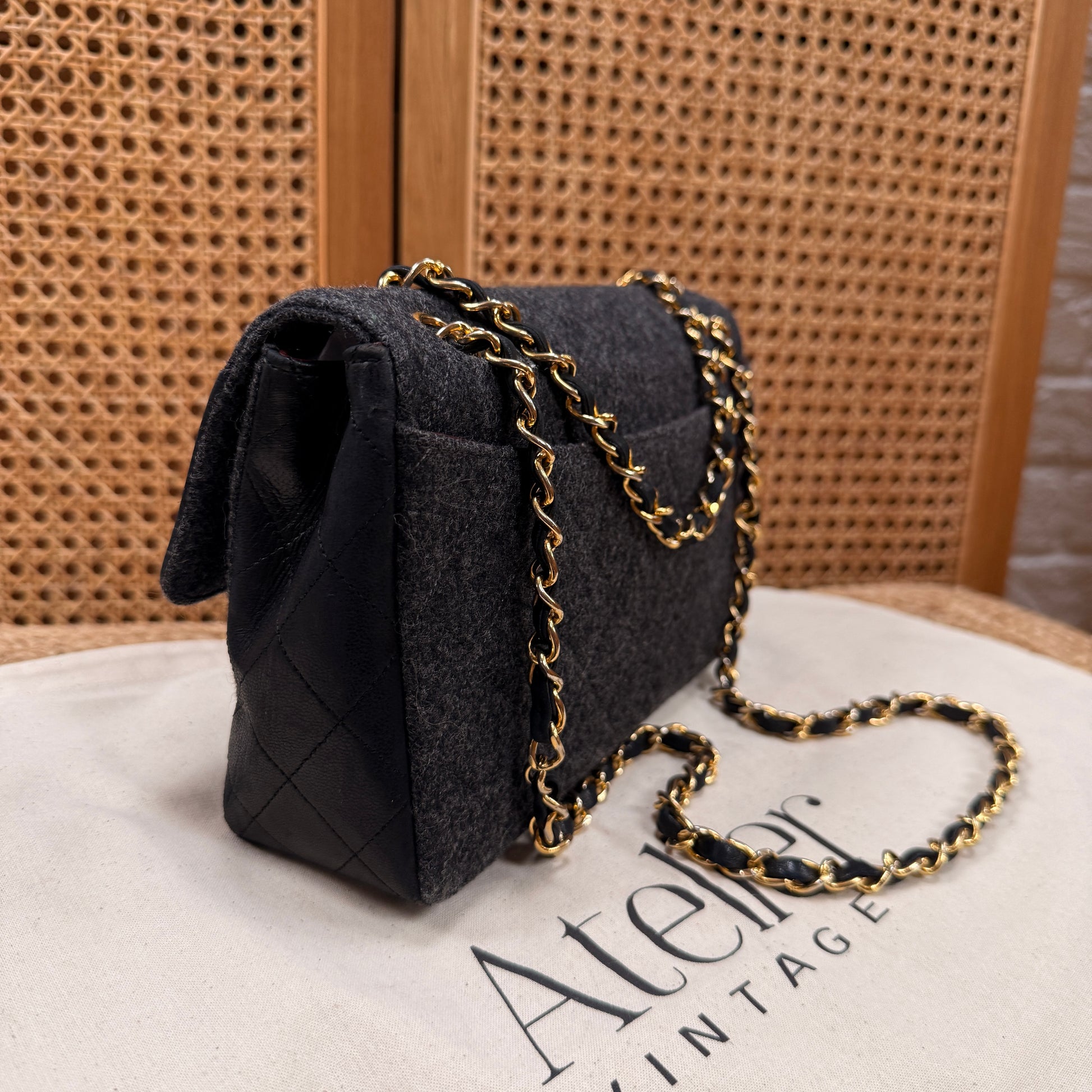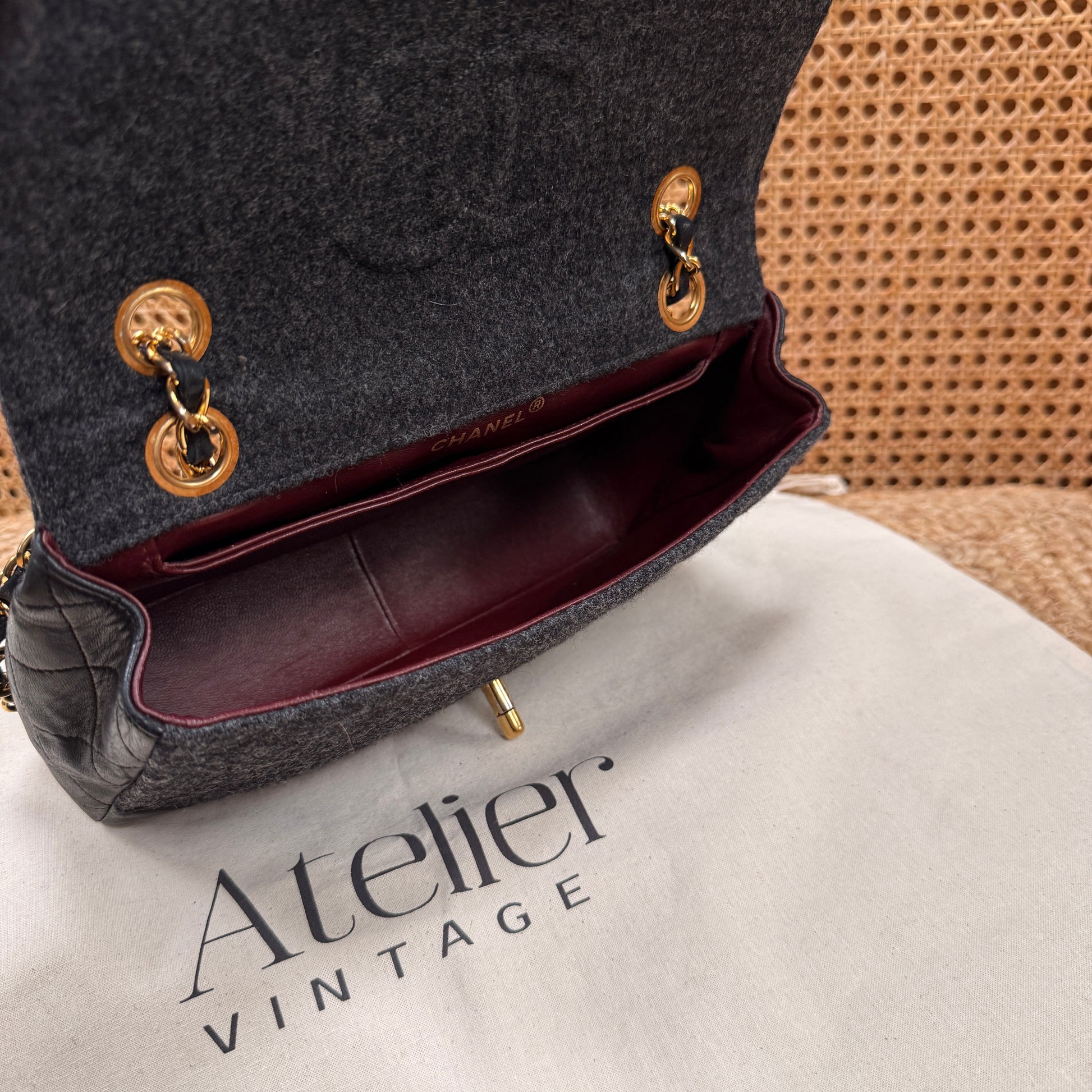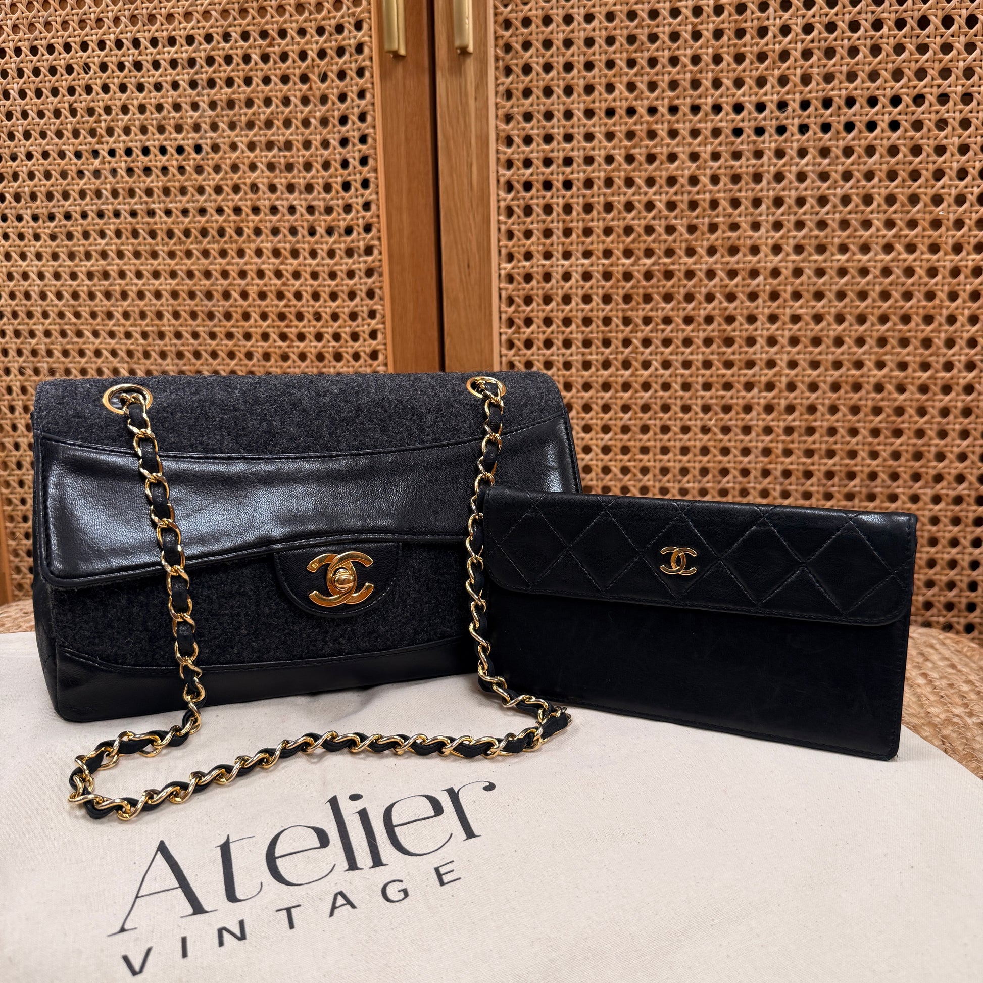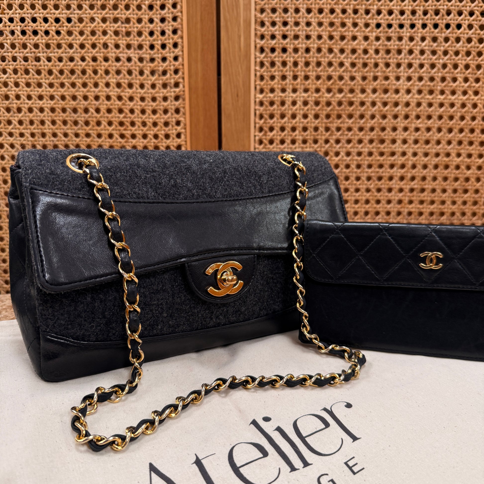 Chanel 1989 Rare Charcoal Tweed Wood & Black Leather Single flap & Purse Set