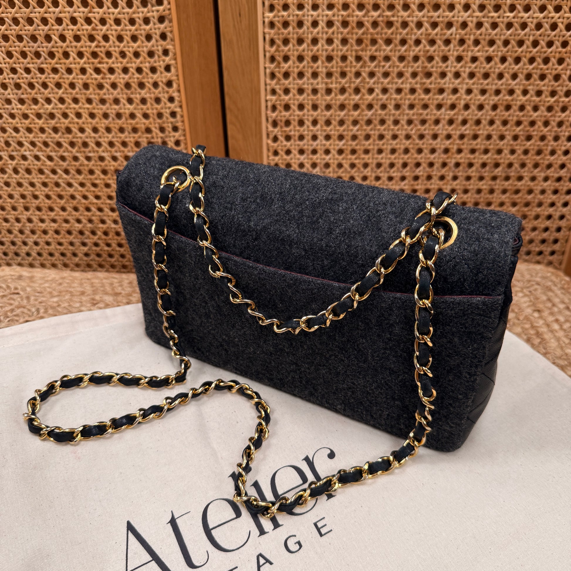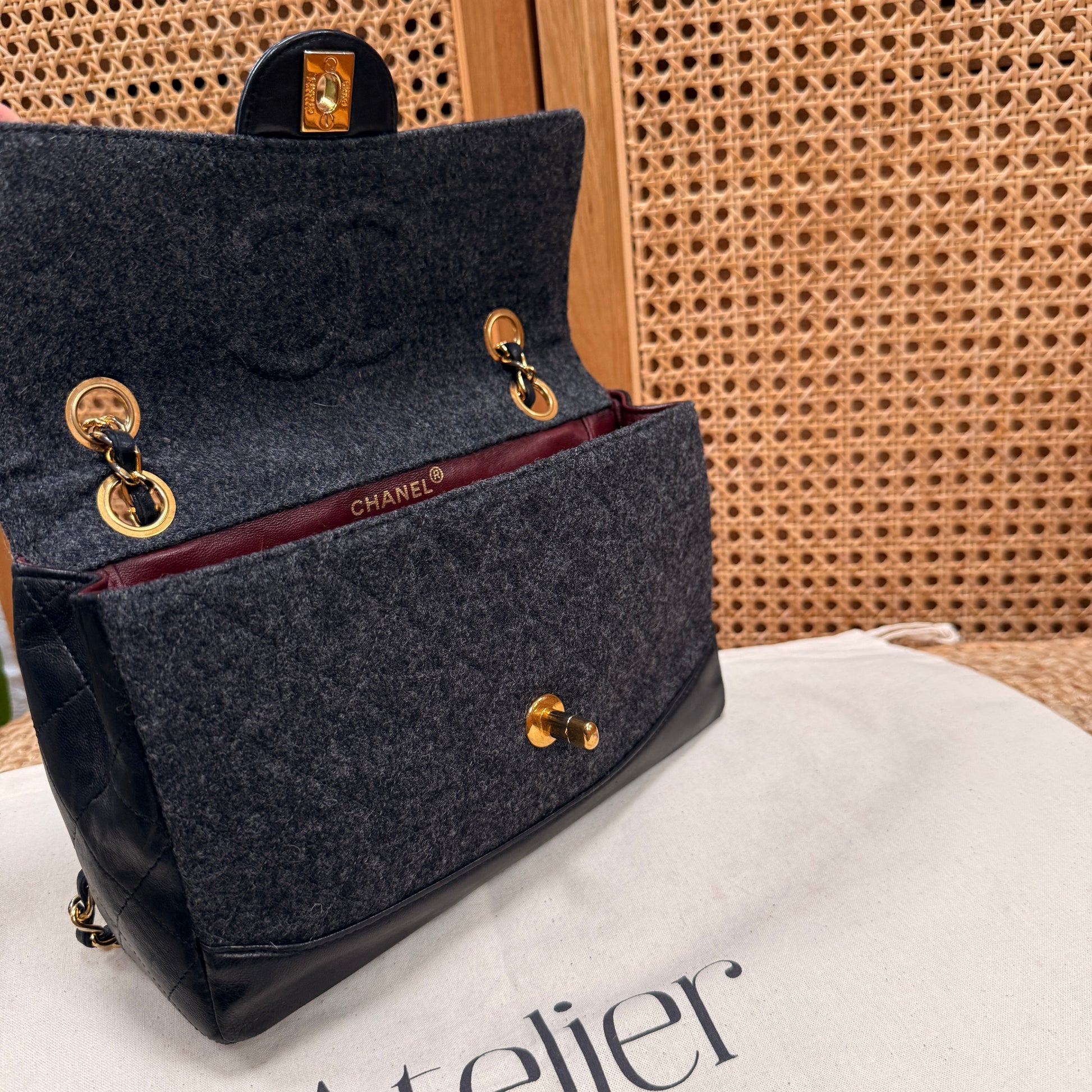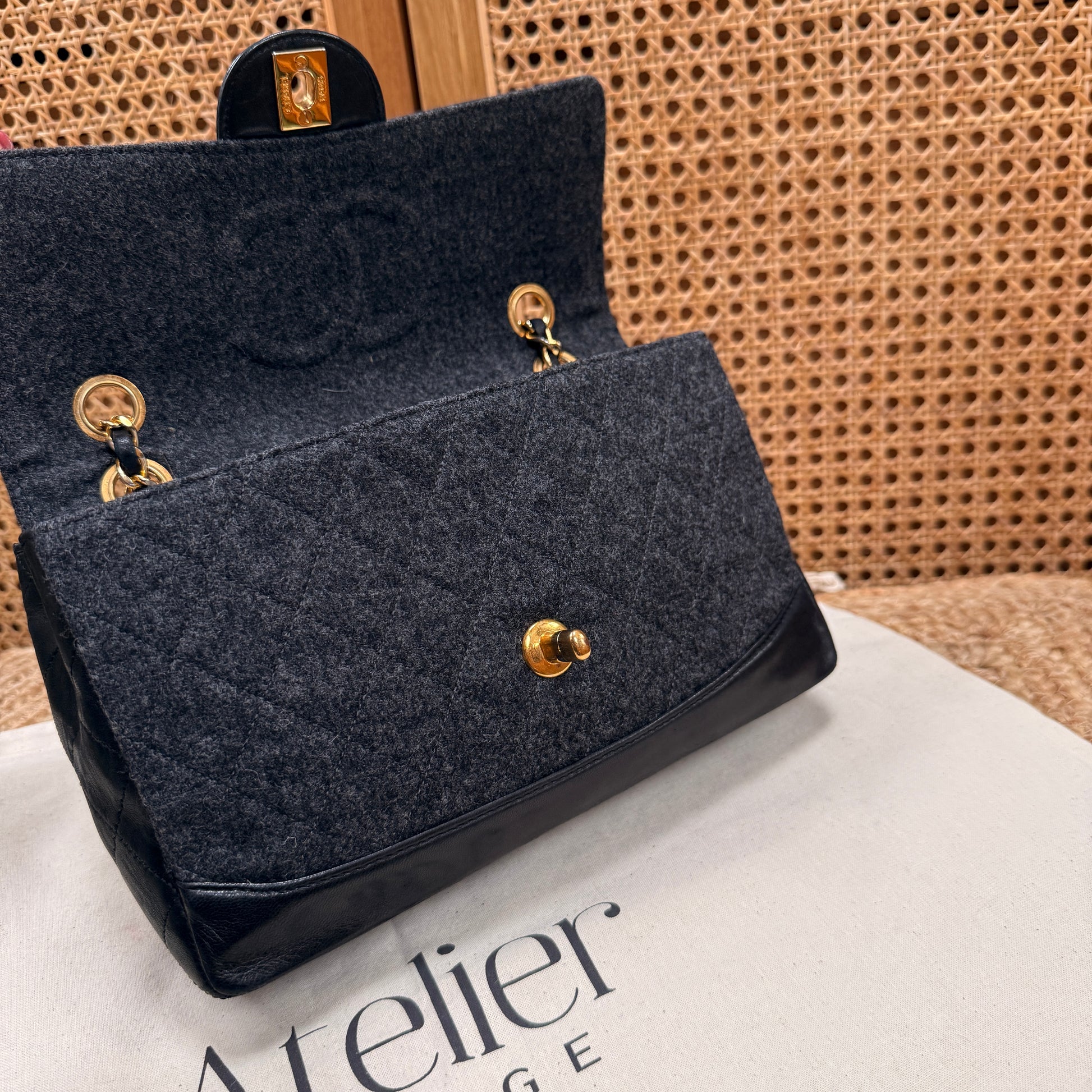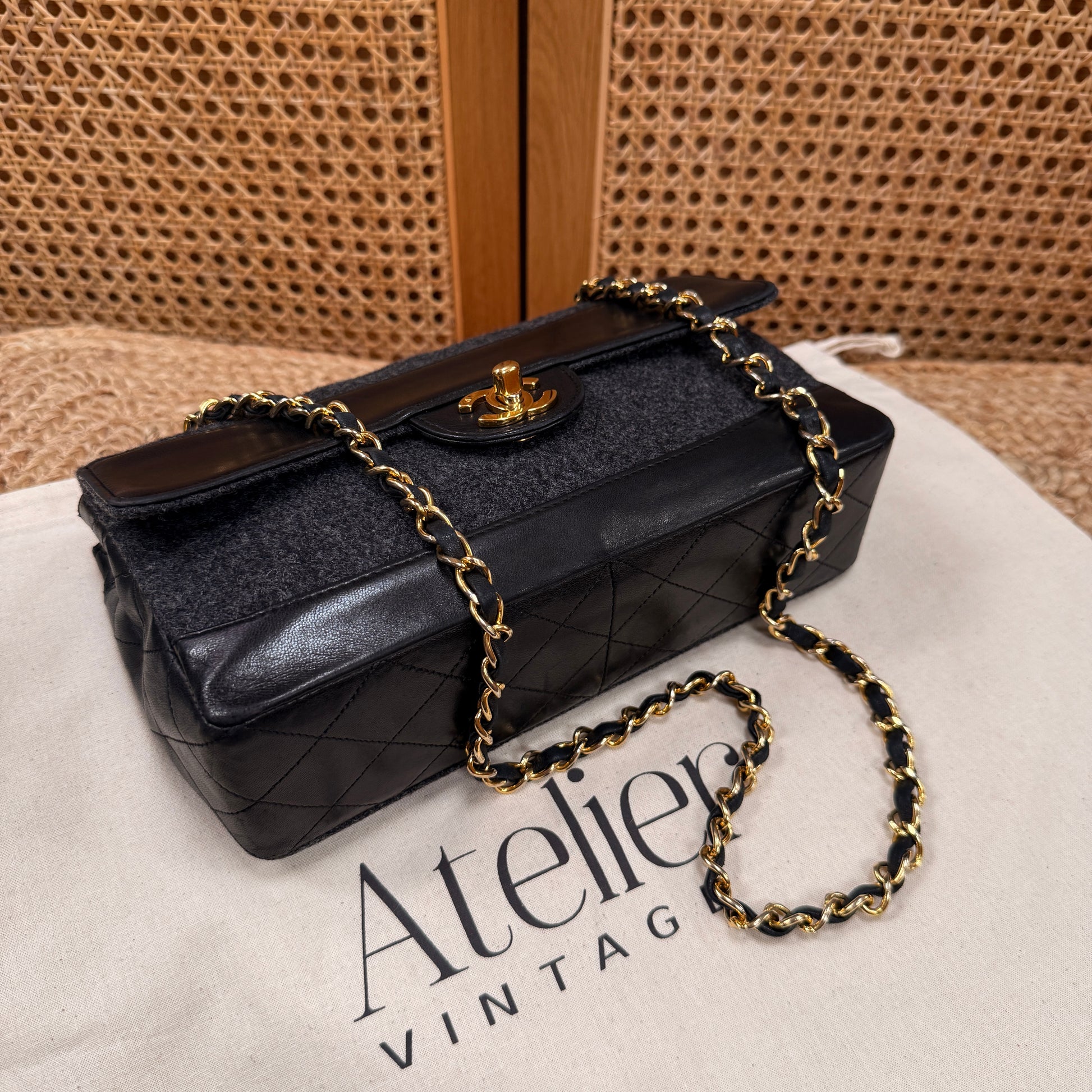 Chanel 1989 Rare Charcoal Tweed Wood & Black Leather Single flap & Purse Set
