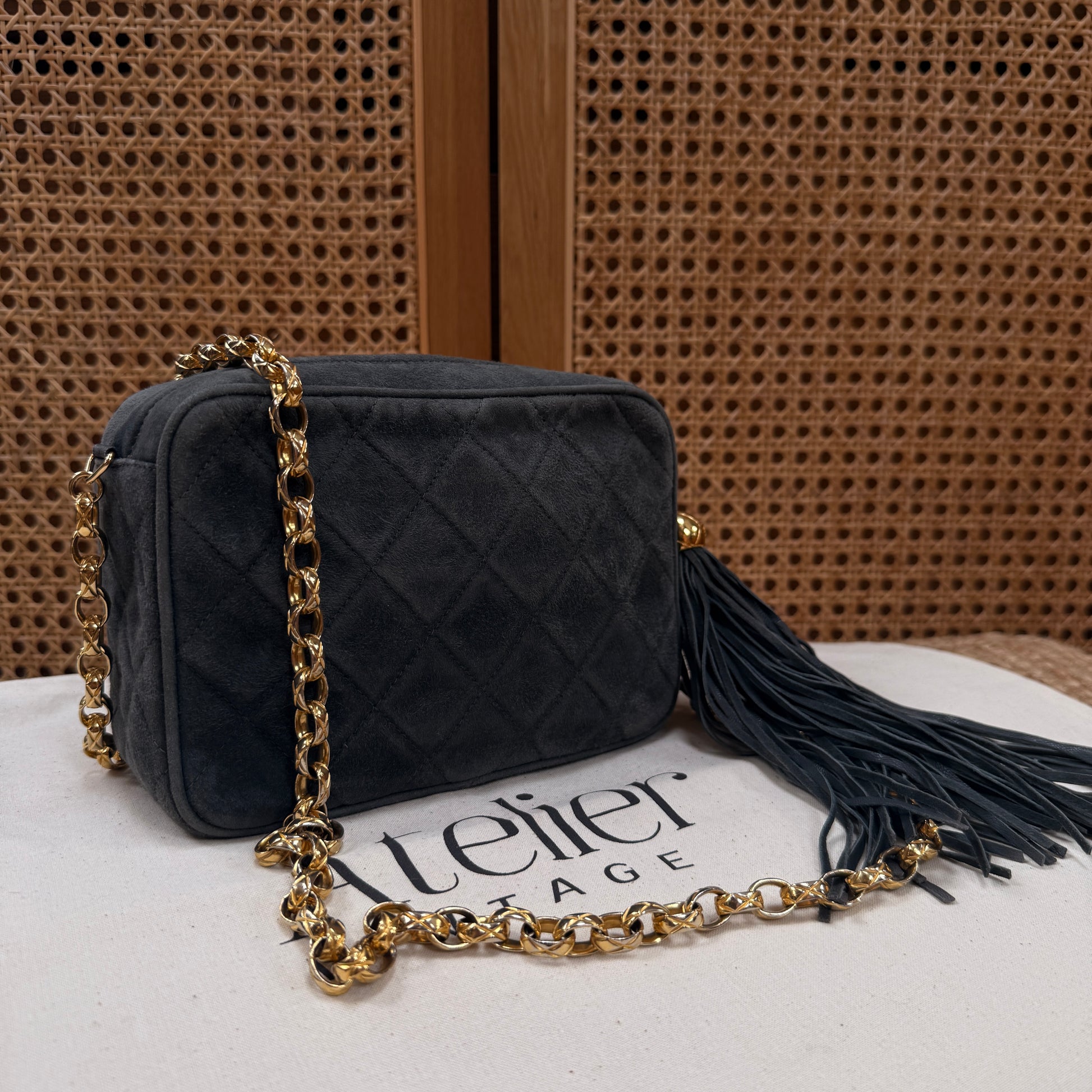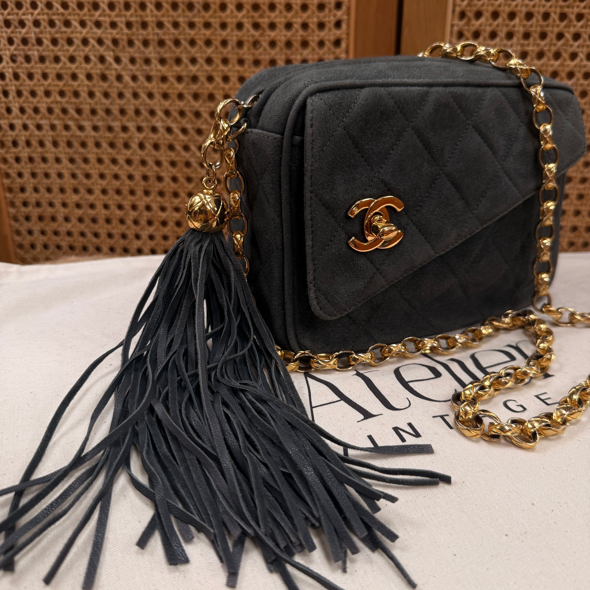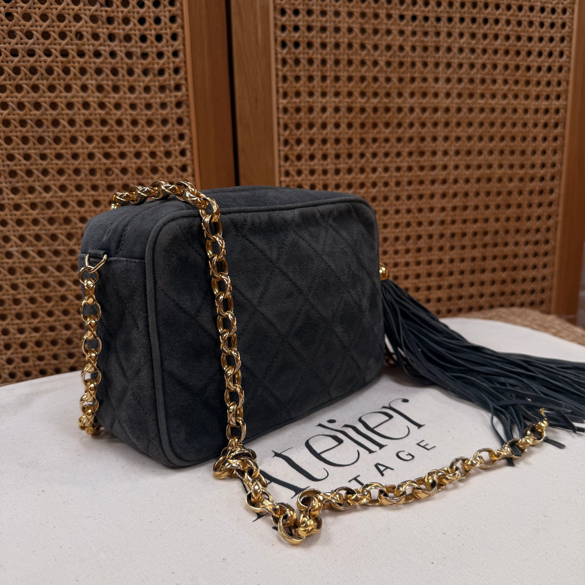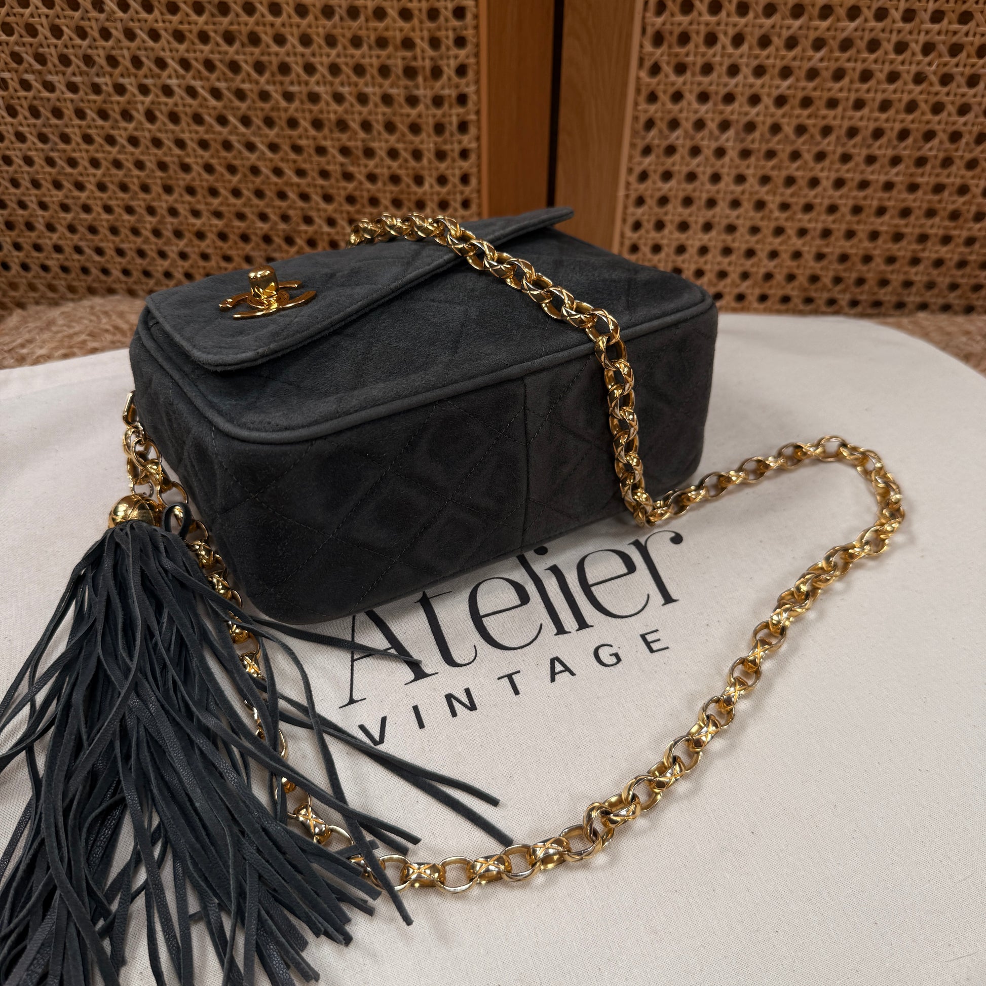 Chanel 1994 rare camera bag with bijoux chain in slate grey suede